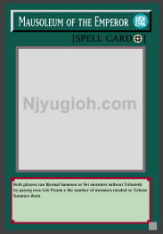 Mausoleum of the Emperor Field Spell Both players can Normal Summon or Set monsters without Tribute(s) by paying 1000 Life Points x the number of monsters needed to Tribute Summon them. SUPER RARE |