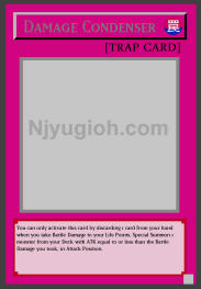 Damage Condenser Normal Trap You can only activate this card by discarding 1 card from your hand when you take Battle Damage to your Life Points. Special Summon 1 monster from your Deck with ATK equal to or less than the Battle Damage you took, in Attack Position. RARE |