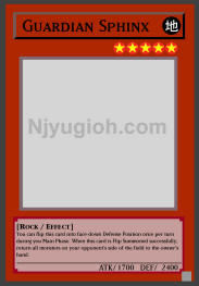 Guardian Sphinx EARTH / Rock / Level 5 / ATK 1700 / DEF 2400 You can flip this card into face-down Defense Position once per turn during you Main Phase. When this card is Flip Summoned successfully, return all monsters on your opponent's side of the field to the owner's hand. SUPER RARE |