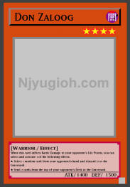 Don Zaloog DARK / Warrior / Level 4 / ATK 1400 / DEF 1500 When this card inflicts Battle Damage to your opponent's Life Points, you can select and activate 1 of the following effects: ● Select 1 random card from your opponent's hand and discard it to the Graveyard. ● Send 2 cards from the top of your opponent's Deck to the Graveyard. COMMON |