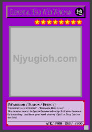 Elemental Hero Wild Wingman EARTH / Warrior-Type Fusion / Level 8 / ATK 1900 / DEF 2300 "Elemental Hero Wildheart" + "Elemental Hero Avian" This monster cannot be Special Summoned except by Fusion Summon. By discarding 1 card from your hand, destroy 1 Spell or Trap Card on the field. RARE |