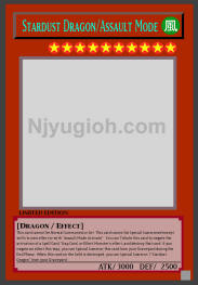 Stardust Dragon/Assault Mode WIND / Dragon / Level 10 / ATK 3000 / DEF 2500 This card cannot be Normal Summoned or Set. This card cannot be Special Summoned except with its own effect or with "Assault Mode Activate". You can Tribute this card to negate the activation of a Spell Card, Trap Card, or Effect Monster's effect, and destroy that card. If you negate an effect this way, you can Special Summon this card from your Graveyard during the End Phase. When this card on the field is destroyed, you can Special Summon 1 "Stardust Dragon" from your Graveyard. ULTRA RARE |