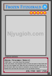 Frozen Fitzgerald WATER / Fiend-Type Synchro / Level 5 / ATK 2500 / DEF 2500 1 DARK Tuner + 1 non-Tuner Beast-Type monster If this card attacks, your opponent cannot activate any Spell or Trap Cards until the end of the Damage Step. When this card is destroyed by battle and sent to the Graveyard, while you control no monsters, you can discard 1 card to Special Summon this card from the Graveyard in face-up Defense Position. SECRET RARE |