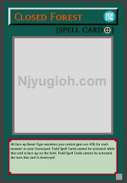 Closed Forest Field Spell All face-up Beast-Type monsters you control gain 100 ATK for each monster in your Graveyard. Field Spell Cards cannot be activated while this card is face-up on the field. Field Spell Cards cannot be activated the turn this card is destroyed. ULTRA RARE |