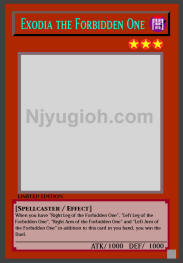When you have "Right Leg of the Forbidden One", "Left Leg of the Forbidden One", "Right Arm of the Forbidden One" and "Left Arm of the Forbidden One" in addition to this card in you hand, you win the Duel.